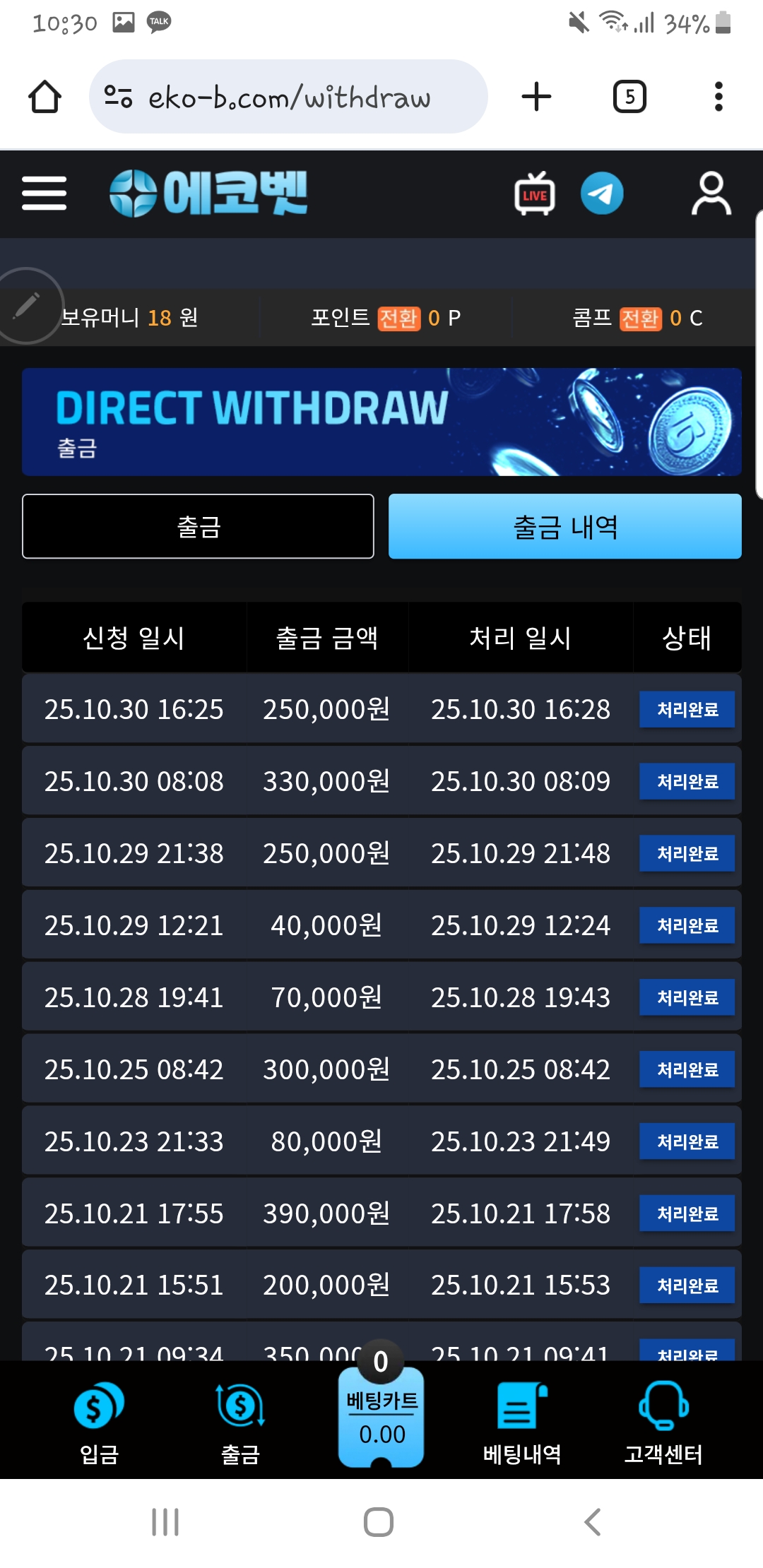 며칠 동안 소액으로 꾸준히 입금하다가 12일에 25만원 충전하고 바카라로 처음 당첨 나서 환전 신청했는데 전화 오더니 양방 배팅이라네요. 인정하면 원금만 준다며 협박하더니 결국 아이디 차단했습니다. 정상 배팅이었는데 정말 황당하고 기분 안좋네요
