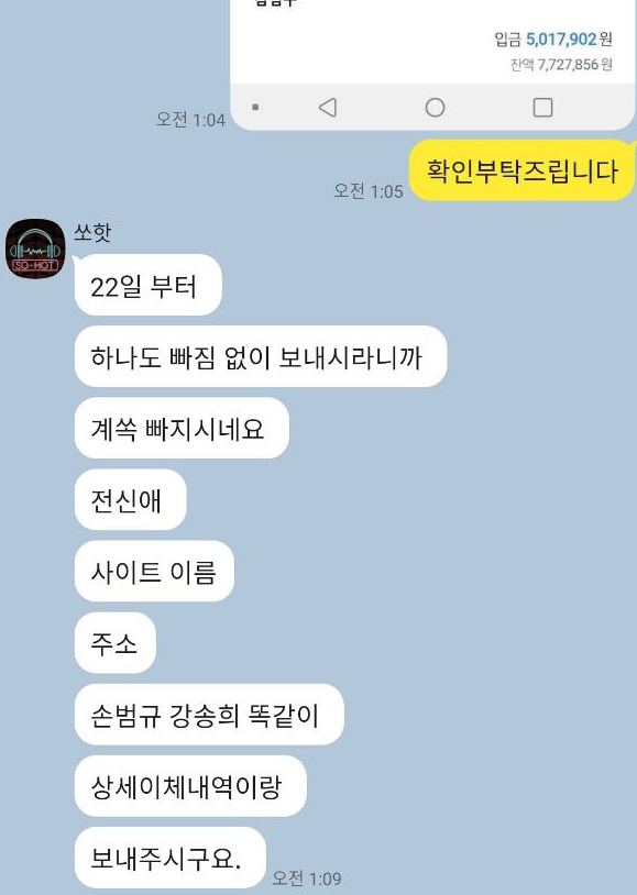 쏘핫 130만 먹튀사이트 이용중단 작성자 정보 kfcburger 작성 2,116 조회 작성일 2022.10.29 11:40 본문 사이트명 사이트명 : 쏘핫 사이트주소 사이트주소 : sh-486.com 일단 아이디부터 차단하고 카톡으로 거래내역 다 보내고 설명 다 하라고하네요 130만원가지고 환전 안해주고 먹튀합니다 관련자료 로그인한 회원만 댓글 등록이 가능합니다. 컨텐츠 정보 목록