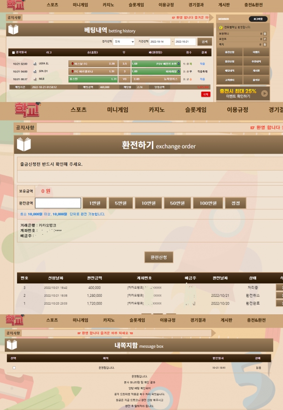 학교 먹튀사이트 제보좀 할게요 작성자 정보 우울라울라 작성 2,176 조회 작성일 2022.10.22 00:07 본문 사이트명 사이트명 : 학교 사이트주소 사이트주소 : sxc78.com 학교라는 곳에서 먹튀당했습니다. sxc78.com 3폴더 스포츠 베팅했고 경기 끝나니 환전 취소하고 원금만 돌려받았습니다. 128만원 먹튀당했어요 양방이 아닌데 어이가 없네요 관련자료 로그인한 회원만 댓글 등록이 가능합니다. 컨텐츠 정보 목록