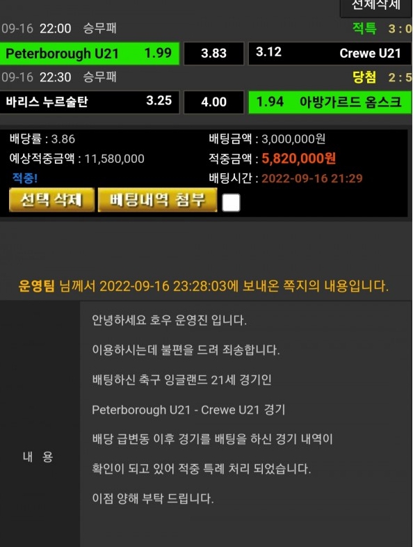 호우 먹튀 제보드려요 내용있음 작성자 정보 픽미업 작성 2,223 조회 작성일 2022.09.17 16:40 본문 사이트명 사이트명 : 호우 사이트주소 사이트주소 : hw-ho.com 호우 1158만원 먹튀 당햇구요 적특처리 합니다 이전에도 두번 그런적이 있었는데 경기종료 5분전에 적특 말인가요 이게 관련자료 로그인한 회원만 댓글 등록이 가능합니다. 컨텐츠 정보 목록